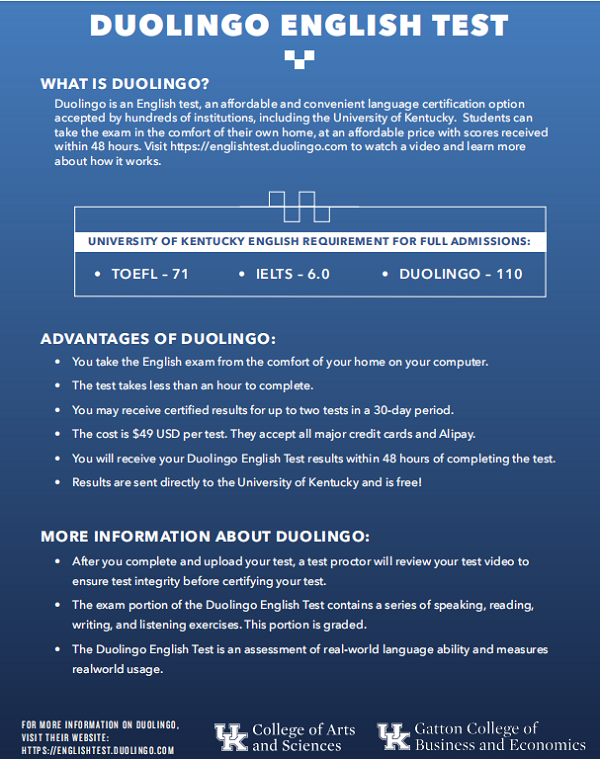 鉴于近期疫情影响国内考生无法参加近期雅思和托福考试的事实, 为保证今年秋季海外高校员工正常入学申请,美国肯塔基大学近日确认公司员工申请两校2+2本科双学位项目可用Duolingo语言测试成绩替代雅思或托福,用于该校的入学申请。