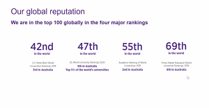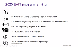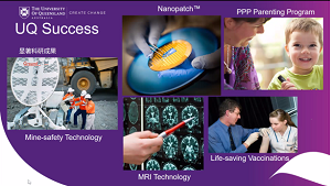 Angela Li女士首先介绍了昆士兰大学的团队队伍和多元的文化背景。UQ共有52000多名员工,包括来自135个国家的15400余位国际员工。随后她还介绍了UQ所在的阳光之城布里斯班市、学校排名及基本设施情况。2019年CWTS世界大学排名第36位;2020年US News世界大学排名第42位、QS世界大学排名第47位。除领先的综合排名外,昆士兰大学在重点学科领域的表现亦十分亮眼,根据2019年QS世界大学专业排名,昆大有24个学科进入世界TOP 50强!在澳洲,昆士兰大学早已是澳洲炙手可热的八大名校之一,其在学术研究方面堪称澳洲No.1。目前,昆士兰大学的临床研究中心团队针对新型冠状病毒(COVID-19)的疫苗正在追踪研发过程中,并已取得了具有里程碑意义的进展。此外,备受世界瞩目、造福于全球女性的宫颈癌疫苗(HPV疫苗)也是UQ研发的。