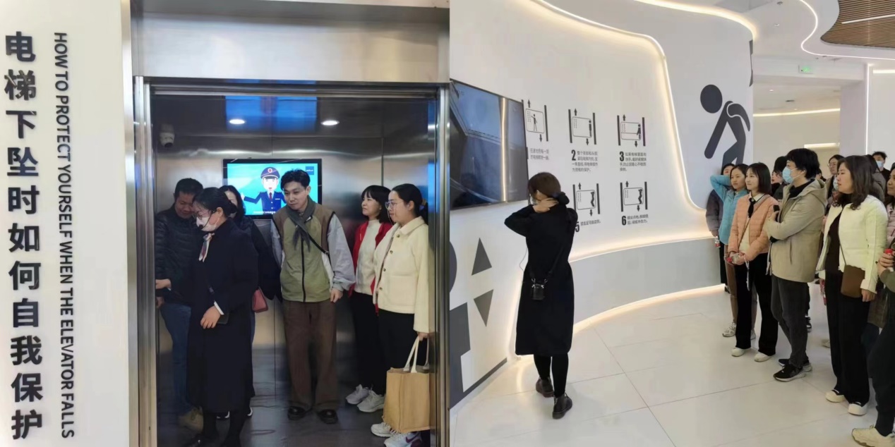 在家庭安全区,大家乘坐模拟电梯,学习到电梯乘坐规范以及遇到电梯突然下坠的应对方法。