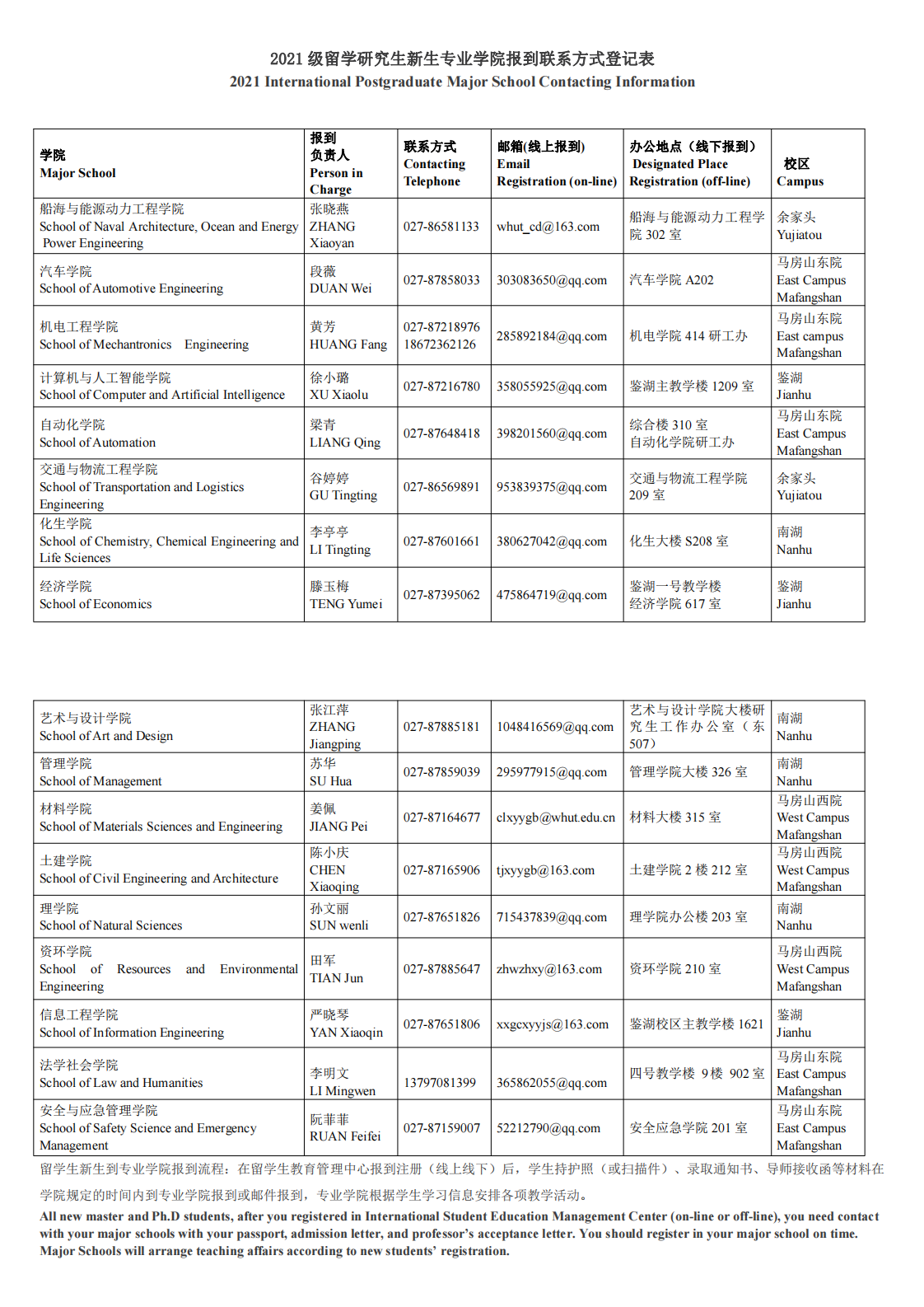 2021 级留学研究生新生专业学院报到联系方式登记表 2021 International Postgraduate Major School Contacting Information