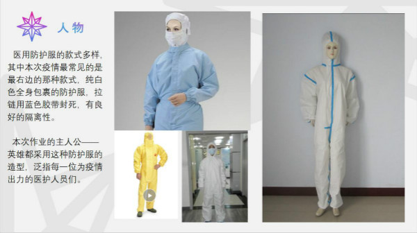 在确定了主题后,我们首先开始了对主人公以及怪物的设定。首先,如何设计出有医护人员感觉的人物,疫情中常见的防护服和口罩是必不可少的。我们先去研究了防护服的设计与元素。