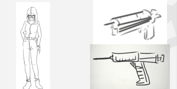 最后,我们认为对于防护服来说,帽子是必不可少的,所以我们最终版人设,将帽子改成了连帽衫的形式,并为人物设计了武器——一个针管做的枪。