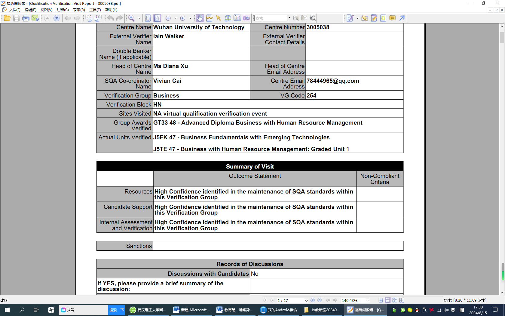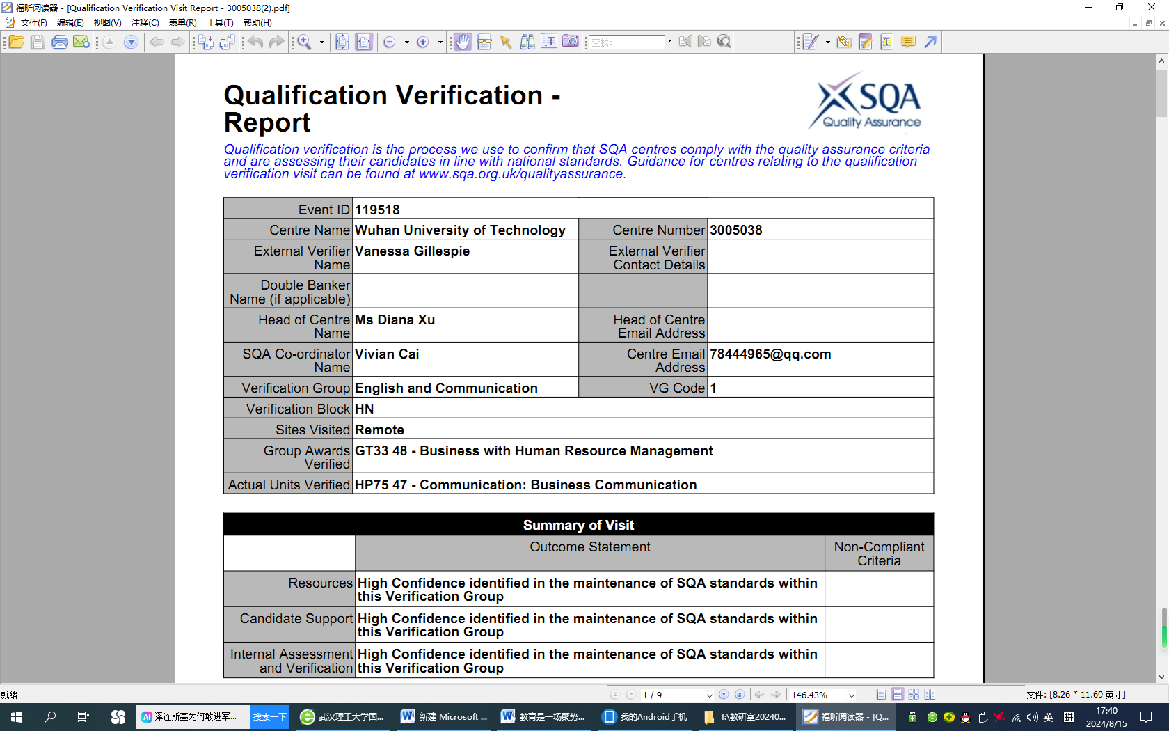 8月13日,英国苏格兰学历管理委员会(Scottish Qualification Authority,简称SQA)对公司SQA项目本学期外审工作进行了反馈。对于此次外审的《新兴技术商务基础》、《人力资源管理分等级考试一》、《纪律与申诉》、《商务沟通技巧》四门专业课,英方外审员对课程的教学资料、考核评价、员工支持、内审制度与流程等方面进行了严格审核,最终外审结果均获得“最高信任等级”(High Confidence)。