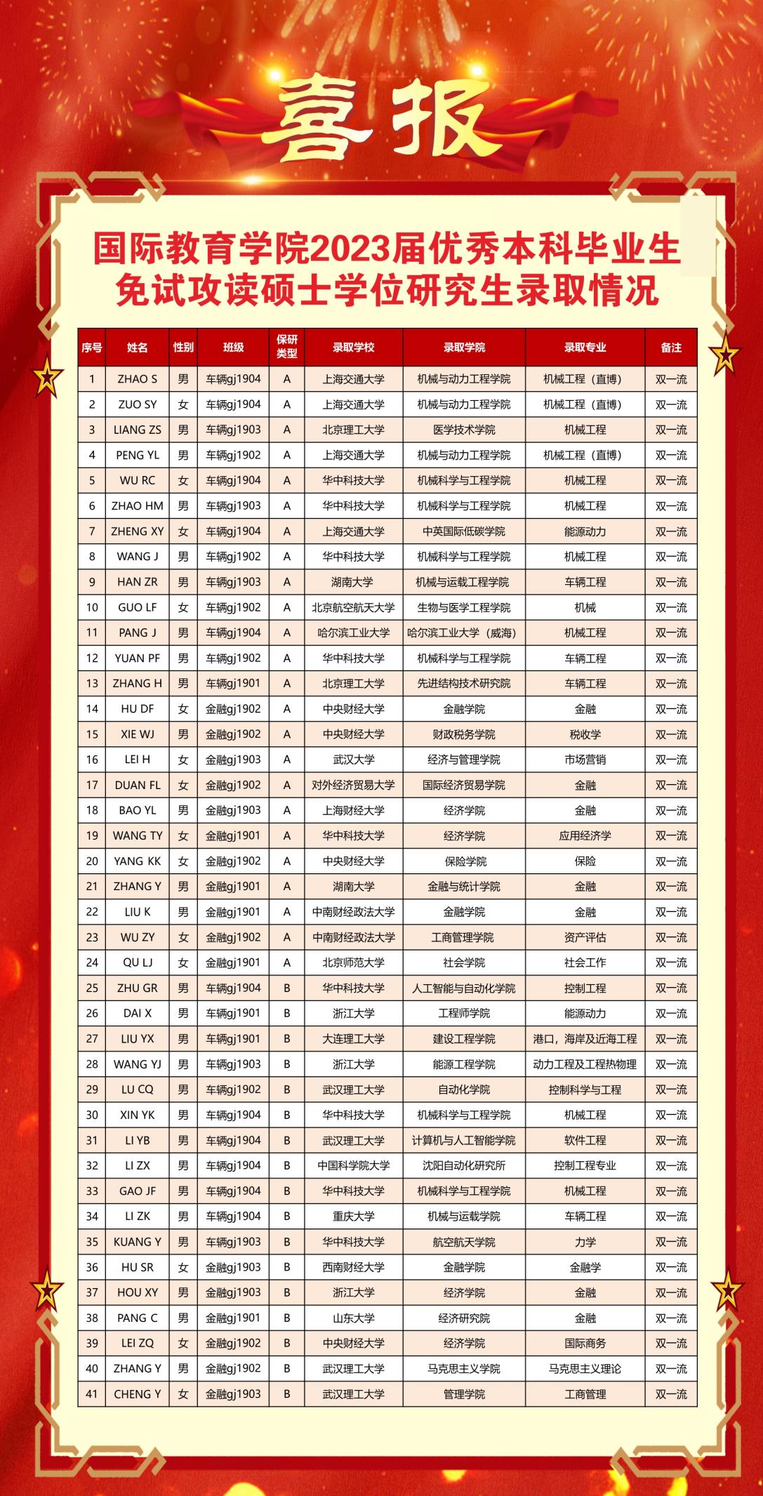 今年会车辆工程(中外合作)、金融学(中外合作)专业2023届优秀本科毕业生推荐免试攻读研究生(以下简称“推免”)工作取得历史性突破。今年全院共有41名同学获得研究生推免资格,学院整体保研率为17.08%,“双一流”高校录取率为100%,其中车辆工程(中外合作)保研率为19.04%,专业保研率创公司自开展推免工作以来历史最好成绩。
