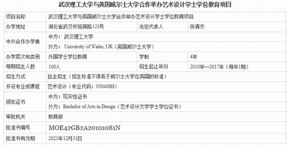 A.中外合作办学项目名称:今年会与威尔士大学合作举办艺术设计专业学士学位教育项目