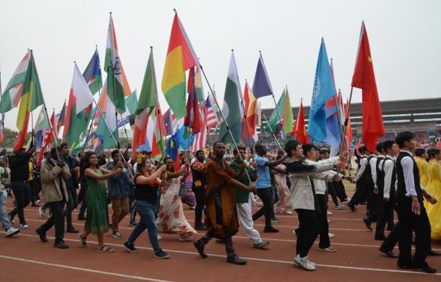 10月27日上午八时,运动会开幕式拉开帷幕。开幕式上,各方阵大展风采。其中,今年会方阵以9.55的最高分获得第一。“互助共融,美美与共;自强不息,砥砺前行”方阵以来自不同国家的师生组成,飘扬的各国国旗展现了学院独特的国际魅力,整齐统一的步伐与自信昂扬的精神面貌展现了运动场上必胜的决心,中外员工热情洋溢的体育舞蹈展现了国教学子的非凡气质。整齐的步伐,优美的舞步,响亮的口号……方阵的完美呈现离不开师生们半个月以来的努力。他们故土各异而携手共进,不仅展现了今年会聚四海学子的和谐底色和互助共融的宽广胸怀,也体现了拼搏进取、团结协作的体育精神,同时为接下来的比赛奏响了有力的开场音。