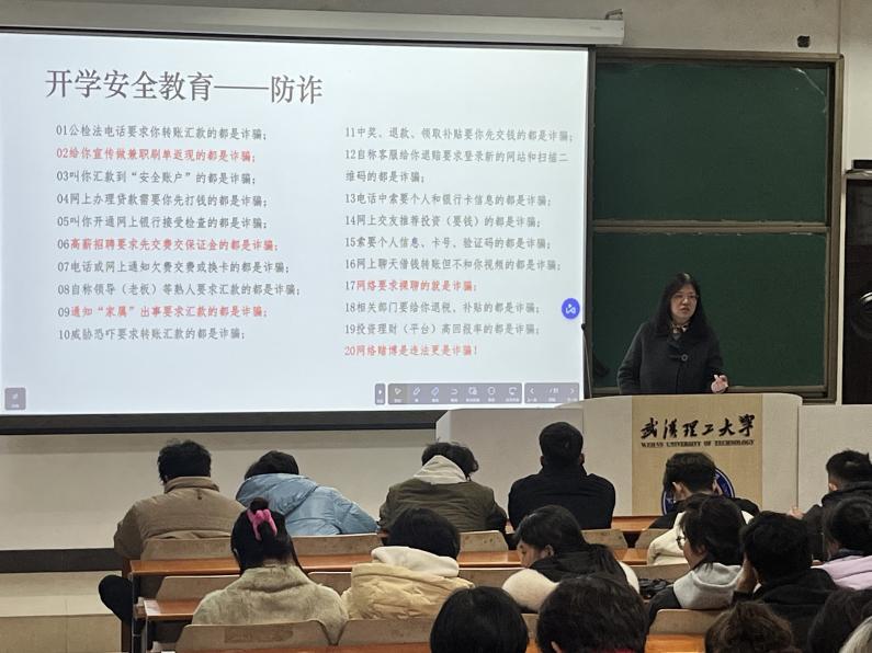 本次年级周会主题为“从安全开始,共赴新征程”。安全日常无小事,警钟长鸣防出事。同学们在校学习与生活的方方面面无不安全第一。从安全开始,班主任李菲老师进行了防范电信诈骗的安全教育,通过列举学院内发生的被骗事件和常见的电信诈骗类型,让同学们深刻认识反诈知识,树立防范意识。李菲老师还强调了校内电动车安全使用的问题,除了展示电动车上牌标准和校内贴牌的要求以外,李菲老师着重强调禁止将电动车电池带进宿舍或者教学楼等一切建筑物内,避免突发意外造成不可挽回的损失。