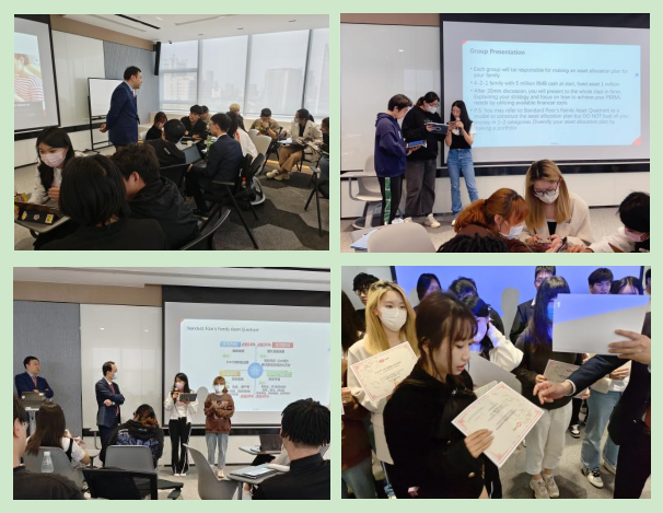 我们观摩模拟个性化情景的金融服务,熟悉零售、工商、环球金融产品和服务,了解中西方国家金融资产分配比例趋势;同学们提出很多有创意的见解,使得互动环节妙趣横生;最后,我们分为五组进行沉浸式讨论。同学们讨论地热火朝天,每组都展示了自己的独特方案和精彩解析,引起了共鸣。当理论与实践相融合时,我深觉自己的专业知识还要不断加强。