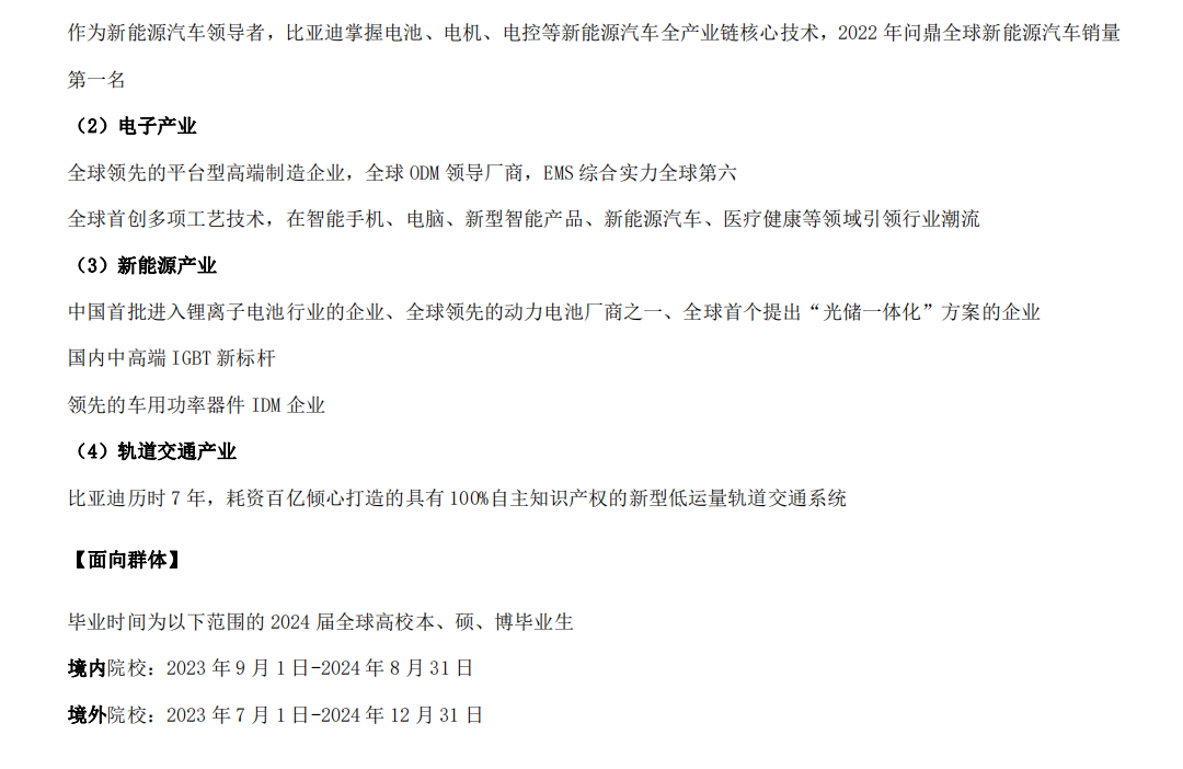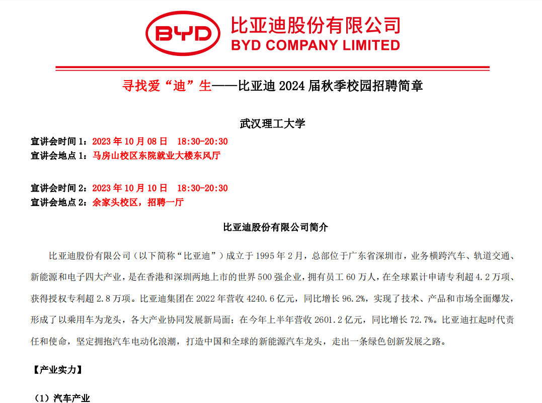 【招聘信息】寻找爱“迪”生——比亚迪 2024 届秋季校园招聘简章