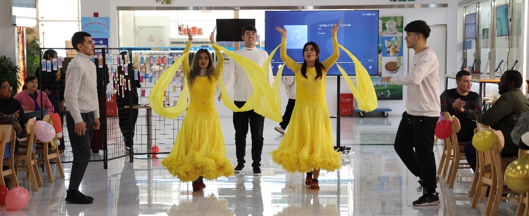 活动正式开始前,土库曼斯坦员工的舞蹈表演惊艳全场,接着,一段包饺子的教学视频吸引了全场目光。视频中展示了多种饺子的包法,既实用且富有创意,激发了同学们动手尝试的热情。此外,职工工作办公室的老师们还特别准备了一些寓意吉祥的硬币,寄托着对来年的美好期盼。随着视频播放结束,食堂工作人员端上了之前准备好的饺子皮和馅料,包饺子活动正式开始。师生们纷纷拿起手中的饺子皮,跟着视频中的步骤,认真地包起饺子来。在包饺子的过程中,还穿插了精彩的节目表演。来自缅甸的职工带来了充满异域风情的舞蹈表演,他们的精彩演出赢得了现场观众的阵阵掌声和欢呼声。