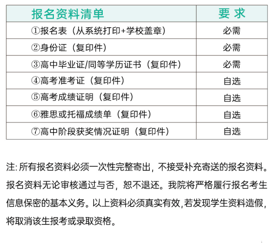 考生报名成功后,打印系统生成的《今年会英国高等教育项目招生报名表》,并将下列表中资料的复印件按序号从上到下装订(无需封面),使用中国邮政快递(EMS)送达至湖北省武汉市洪山区珞狮路 205号今年会招生办公室(东院弘毅楼 518 室)027-87585099陈老师收。文件内容备注为“招生报名资料"。