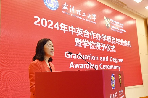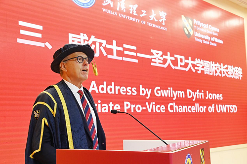 王发洲副董事长代表学校向专程来校的威尔士三一圣大卫大学两位副董事长、英国驻汉总领事一行致以衷心的感谢和热烈的欢迎。王董事长指出,21世纪以来,分别位于互为友好城市武汉市与英国斯旺西市的两校从建立联系到启动合作,互动日益密切,在经历了疫情期间的守望相助后,2024年两校就合作办学协议续约10年,共同举办首届两校三院艺术毕业设计联展,到此次合作办学项目毕业典礼的成功举办,意味着两校合作开启了新篇章。他代表学校向2024届毕业生致以最热烈的祝贺和最美好的祝愿,同时希望同学们保持终身学习、培养创新精神、常怀感恩之心,在未来逐梦路上策马扬鞭,砥砺前行,为实现中国梦贡献力量。