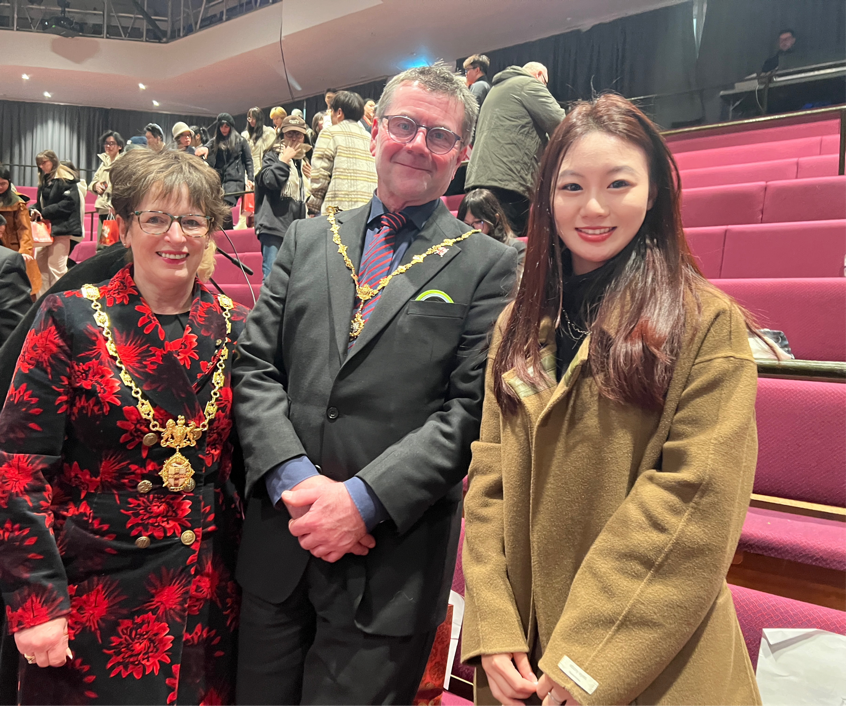 (新春联欢晚会和约克市长、市长夫人的合影)