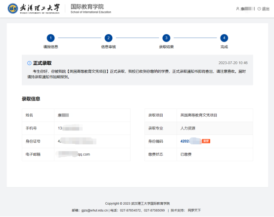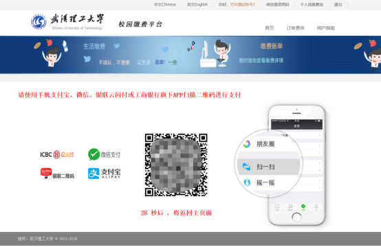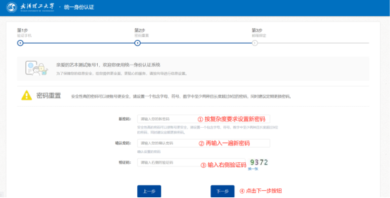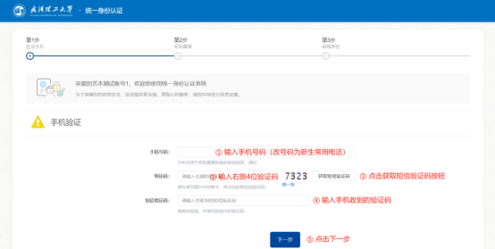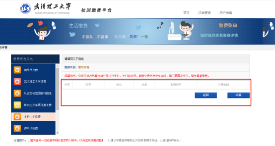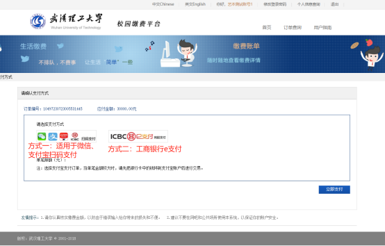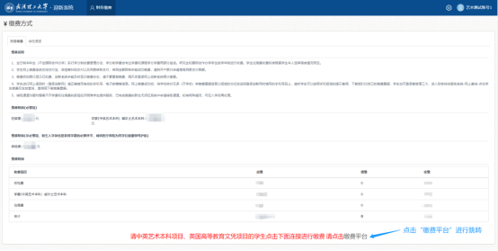 为了方便大家顺利完成迎新系统缴费操作,请阅读以下操作指南。统一身份认证是入学后新生访问各类校园信息系统的通用身份凭证,请在首次登录时认真完成个人信息确认。1.电脑端使用浏览器访问http://gjhzzs.whut.edu.cn/,点击“录取结果查询”,使用报名时的手机号登录招生报名系统后,通过预录取信息查看自己的“身份编码”;点击“缴费入口”网址链接进入统一身份认证。2.首次登录时,初始密码为身份证后六位(若身份证最后一位是字母X,需要大写),点击“立即登录”。3.完成手机号验证,请确保手机号为新生常用电话号码。4.按复杂度要求,设置新的密码,新密码需要满足的条件为“包含字母、符号、数字中至少两种且长度超过8位的密码”,请妥善保管密码,避免泄露。后续通过统一身份认证登录校园信息系统时,请使用新密码进行登录。4.(非必要完成步骤)进行邮箱绑定,该步骤可跳过。点击弹框中的“确认”按钮。完成身份认证后,系统会自动跳转进入迎新系统,可以看到需要缴纳费用的明细。点击“缴费平台”链接,进行跳转,进入校园缴费平台。