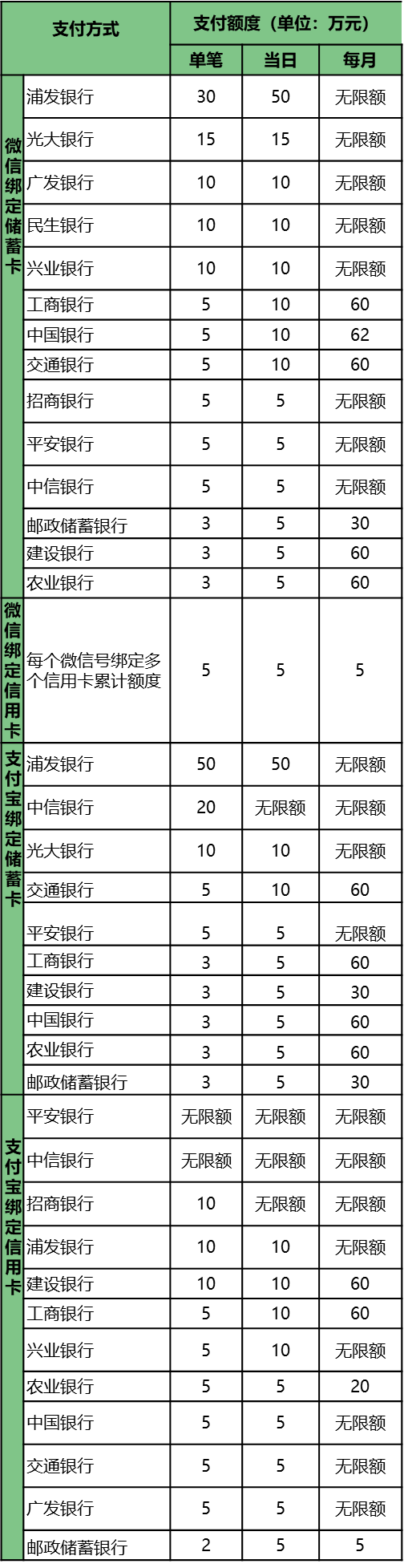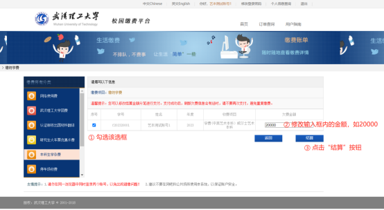 对于分次缴纳的情况,重复以上步骤直至全额学费缴纳完成。当缴费平台中无待缴项时,代表缴费完成,如下图所示。 3.在校园缴费平台完成缴费后,可回到招生报名系统http://gjhzzs.whut.edu.cn/,点击“录取结果查询”,使用报名时的手机号登录后,查询缴费结果。缴费状态为“已缴费”说明学费已完成缴纳。备注:微信、支付宝绑定不同银行卡的支付额度可参考以下列表,具体可拨打微信客服电话95017、支付宝客服电话95188进行咨询。