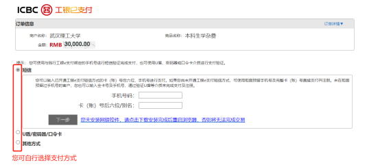 1.点击“国际合作教育自主招生项目学杂费”菜单,进行跳转。2.若银行卡每日交易限额低于学费总额,无法一次全额缴费。对于此类情况,可以对学费进行金额拆分,分次完成缴纳。举例:如学费为5.5万元,银行卡A的每日交易限额为4万,银行卡B的每日交易限额为2万。则可拆分为4万、1.5万,分两次进行缴纳。操作步骤如图所示:方式一:根据页面提示,您可以选择相应支付渠道进行扫码支付。方式二:选择该方式时务必使用IE浏览器访问(Edge浏览器),并且根据页面提示选择支付方式。