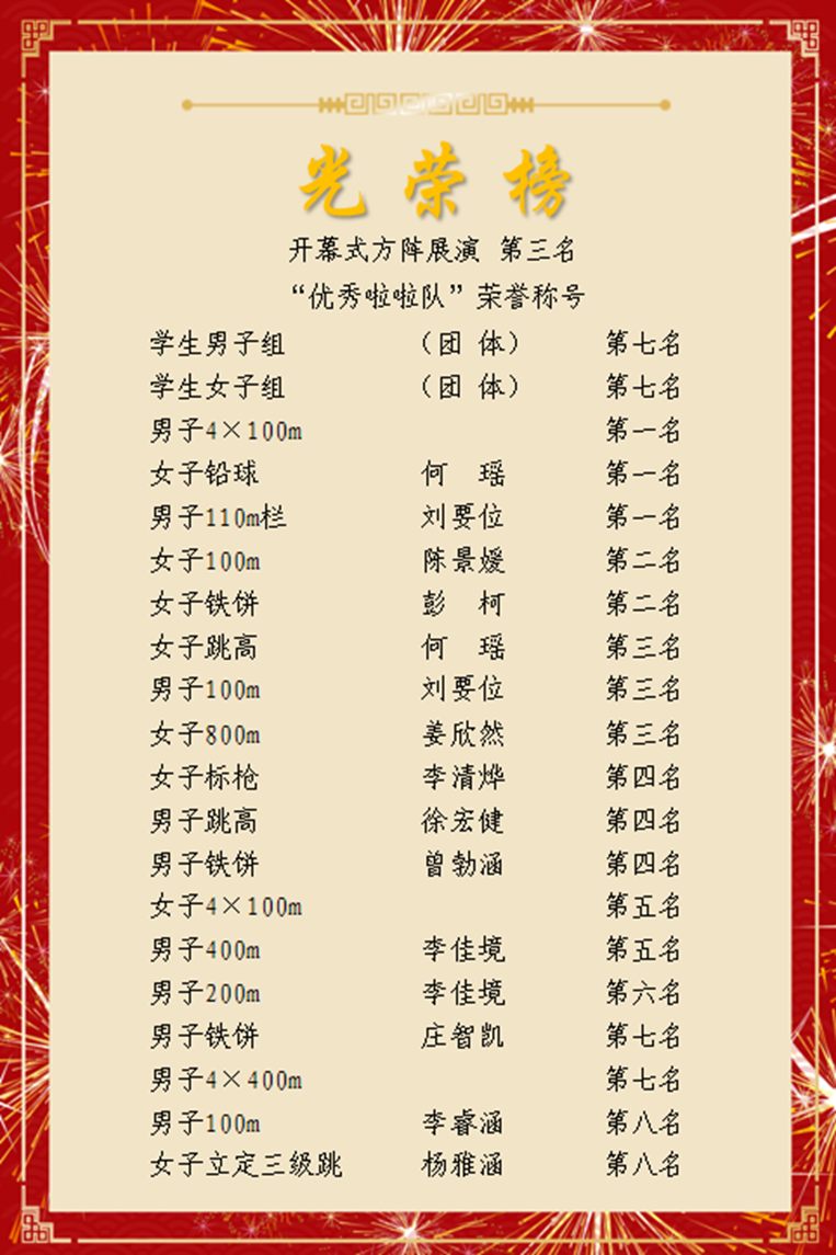 运动会已圆满落幕,今年会运动员们在赛场上展现出的顽强拼搏、超越自我的精神,将会继续激励我们在未来的道路上勇往直前,用实际行动书写更加辉煌的篇章!