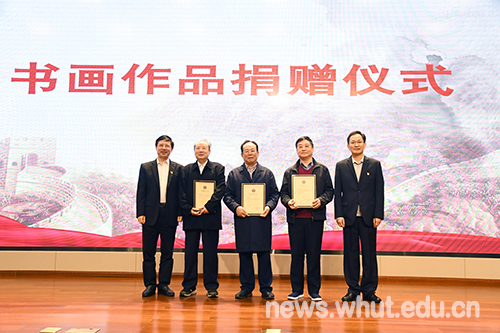 袁伟将军、彭光谦将军、李汉文将军代表此次参展的139名将军艺术家们向学校捐赠了书画作品,并现场挥毫题字勉励师生。信思金书记代表学校接受捐赠。彭光谦将军还为在场师生带来了《世界百年未有之大变局与中美关系》专题报告。