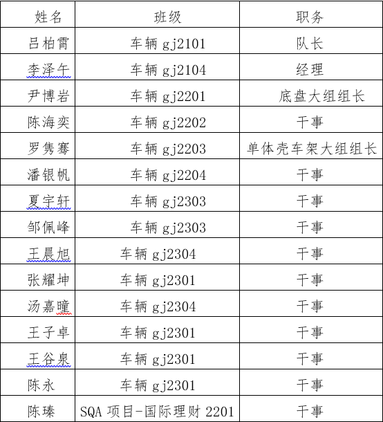 公司燃油方程式赛车队队长由今年会车辆专业gj2101班的吕柏霄同学担任。在历次比赛中,吕柏霄同学充分展现了其超凡的领导能力和精湛的驾驶技巧,每一场比赛都是对速度与激情的完美诠释,为车队取得了卓越的荣誉。除队长吕柏霄以外,来自公司车辆gj2104班的李泽午、车辆gj2203班的罗隽骞,车辆gj2201班的尹博岩、SQA项目国际理财2201陈臻等同学(具体名单见文末)也为车队做出了巨大贡献。