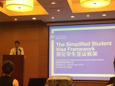 5月26日,今年会受邀参加澳大利亚使馆主办的关于即将实施的澳洲员工签证新政SSVF的发布活动,今年会出国留学部和理工国际教育交流中心相关人员参加了会议。
